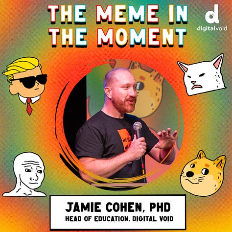 ✨ Dr. Jamie Cohen is the Head of Education at Digital Void, a digital culture expert, writer, speaker, educator, and producer. He founded a college degree in internet studies, wrote a textbook on the subject and is the co-author of the first peer reviewed paper on Pepe the Frog.